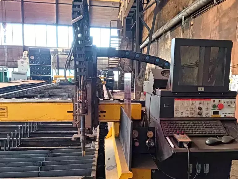 Machine d’oxycoupage et découpe plasma AJAN SHP 260 a été construite en 2015 en Turquie par Ajan Elektronik Servis San. Ve Tic. Ltd Şti. La machine, qui se distingue par sa grande efficacité, est un excellent choix pour la découpe thermique des tôles. Le processus d’usinage est réalisé au moyen de torches fiables, situées sur deux portiques distincts. Cette solution, combinée à la grande surface de la table de travail, permet d’usiner plus d’une tôle à la fois avec différentes méthodes de coupe. La machine d’oxycoupage et découpe plasma AJAN est proposée avec un équipement qui comprend, entre autres, une source de plasma HYPERTHERM de la plus haute efficacité énergétique, un système d’extraction des gaz d’échappement et un chemin de roulement. Le poids total de la machine est de 520 kg.