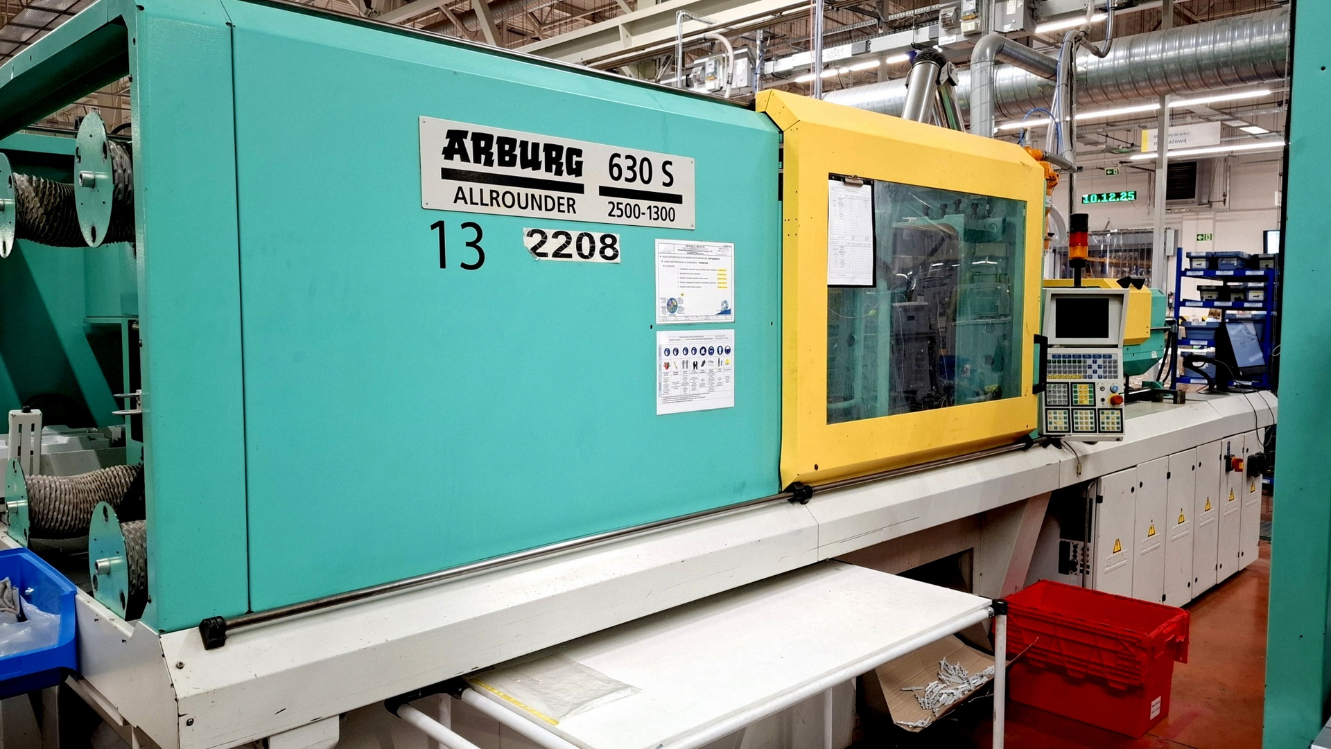 ARBURG ALLROUNDER 630S 2500-1300 fröccsöntő gép 2000-ben gyártotta Németországban az ARBURG GmbH + Co. A gép, amelyet nagy hatékonysága és megbízhatósága jellemez, tökéletes választás a különböző színű, formájú és méretű műanyag alkatrészek gazdaságos gyártásához. Ezeket az alkatrészeket fröccsöntéssel állítják elő, amely során a műanyagot egy szerszámba adagolják, majd nagy sajtolóerővel összeszorítják. A gyártott alkatrészek nagyfokú ismételhetőségét egy precíziós szerszámbefogó rendszer biztosítja, amely maximálisan 250 tonna erővel működik. Az ARBURG ALLROUNDER 630S a robot és a szállítószalaggal együtt kerül forgalomba. Ez a megoldás lehetővé teszi a kész fröccsöntött alkatrészek automatikus összegyűjtését és gyűjtőedényekbe történő szállítását. Az ALLROUNDER 630S 2500-1300 fröccsöntő gép súlya 14000 kg.