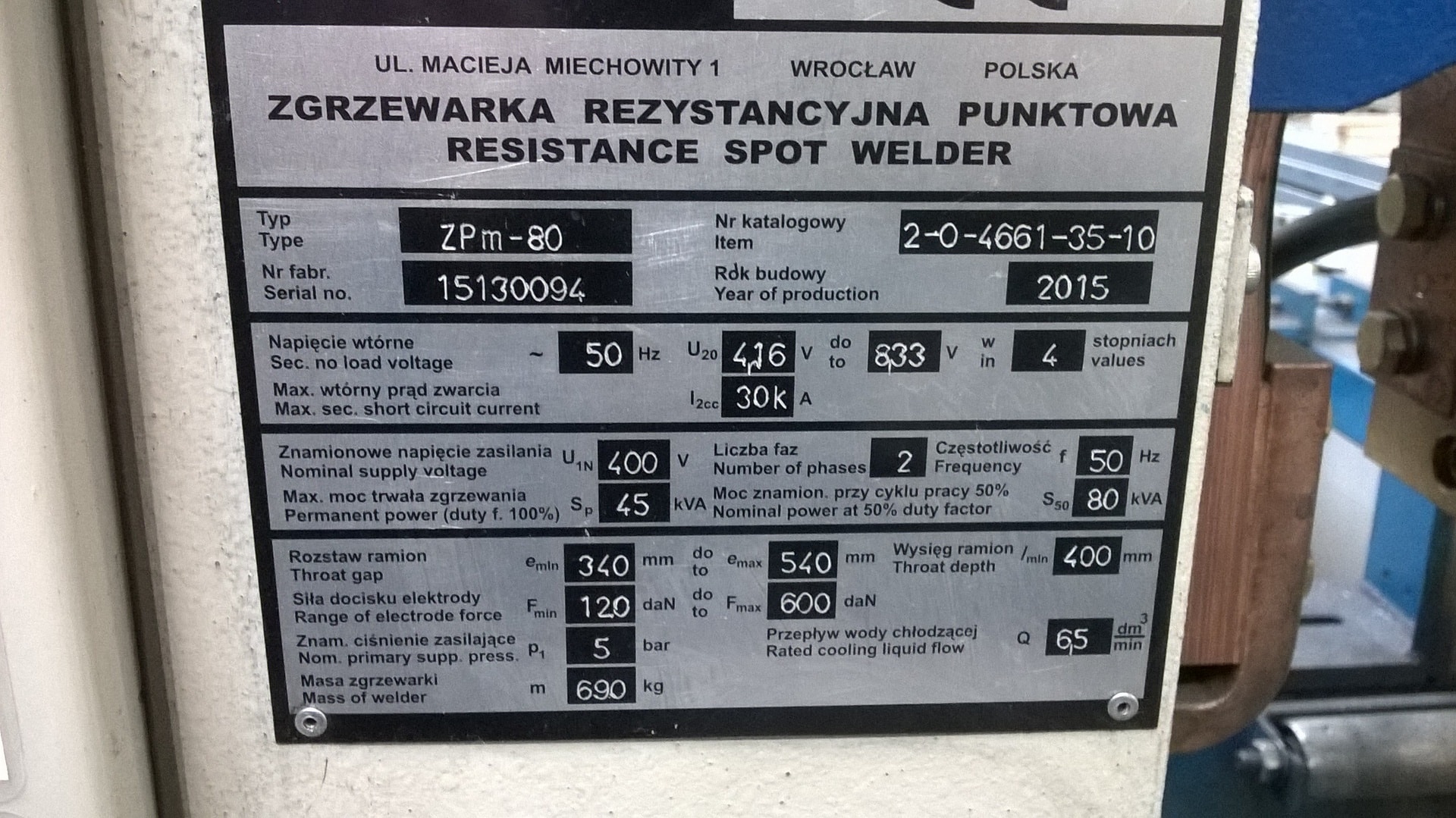 ASPA ZPm-80 ponthegesztő gép, amelyet 2015-ben gyártottak Lengyelországban, többek között alumíniumból, rozsdamentes acélból, sárgarézből és fekete acélból készült munkadarabok ellenállásos pont- vagy vetülékhegesztésére tervezték. A folyamat során a gép két, legfeljebb 6 mm vastagságú fémlemezt melegít, amíg azok képlékeny állapotba nem kerülnek, hogy lehűlés után elválaszthatatlan egésszé egyesítse őket. A munkadarabok összeillesztését elektródák végzik, amelyeken keresztül ponthegesztés esetén 191 kVA, illetve vetülékhegesztés esetén 197 kVA maximális áram folyik át. A ZPM-80 pont- és vetülékhegesztő gép az elektródák hűtésére szolgáló OMI CHW M21 hűtővel, lábvezérlővel és elektródákkal van felszerelve. A gép teljes tömege 690 kg.