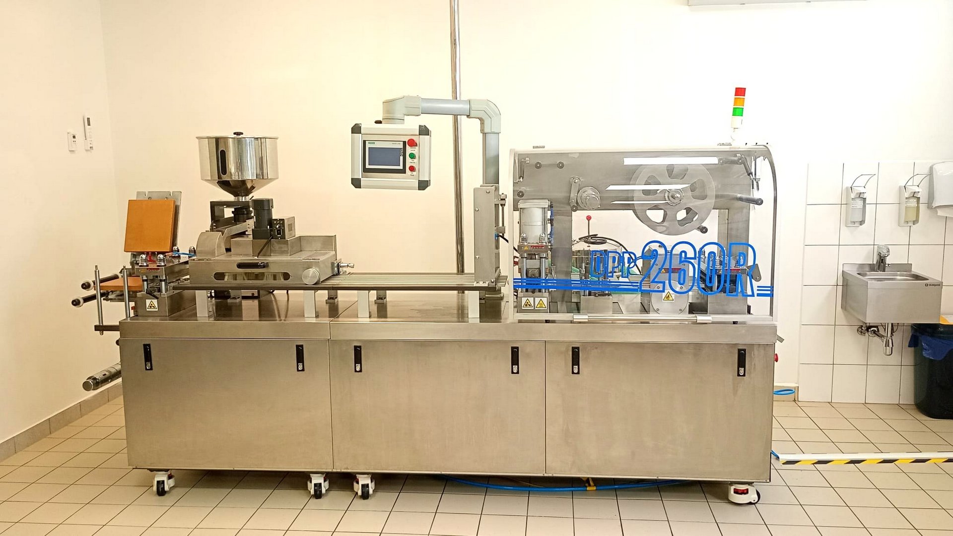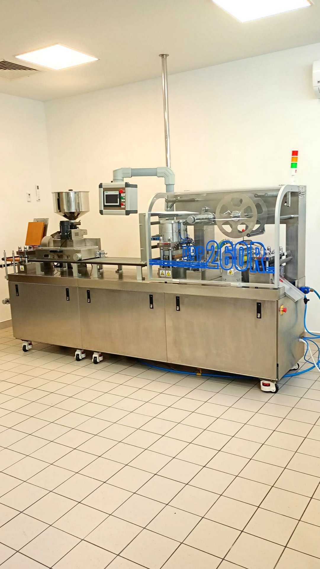 Maszyna do pakowania w blistry DPP-260R wykorzystywana jest w przemyśle farmaceutycznym do automatycznego pakowania m.in. tabletek, kapsułek i pigułek w opakowania typu blister. W jednym cyklu roboczym urządzenie dozuje produkty, zamyka blister folią, nadrukowuje datę/numer serii i odcina gotowe opakowanie. Wysoką powtarzalność i precyzję pakowania zapewnia szereg niezawodnych komponentów o najlepszych parametrach technicznych. Niezwykle stabilna konstrukcja spełnia ponadto rygorystyczne normy GMP, jak i zapewnia łatwą konserwację maszyny. Wszystko to sprawia, że oferowana automatyczna maszyna do pakowania w blistry o doskonały wybór do podniesienia wydajności pakowania wyrobów medycznych. Całkowity ciężar maszyny wynosi 1400 kg.