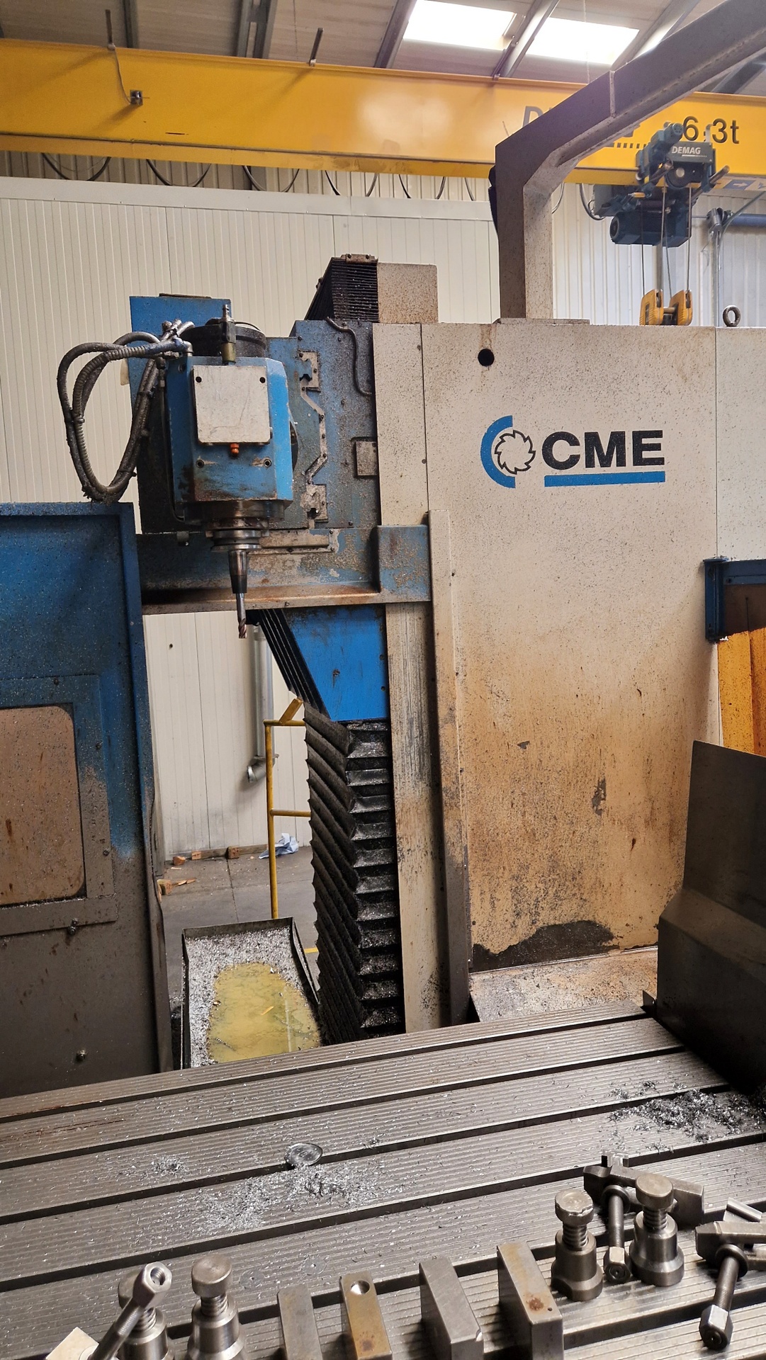 Frezarka CNC CME FS-1 zbudowana została w 2004 roku w Hiszpanii przez MAQUINARIA CME. Maszyna znajduje zastosowanie w precyzyjnej obróbce ciężkich detali o maksymalnej wadze 4000 kg. Proces obróbczy realizowany jest na dużym stole roboczym za pomocą niezawodnego wrzeciona, obracającego się z maksymalną prędkością 4000 obr/min. Konstrukcja wykonana z najwyższej jakości surowców zapewnia z kolei wysoką stabilność procesu poprzez ograniczenie drgań powstałych podczas frezowania. Całość uzupełnia zaawansowany system sterowania marki HEIDENHAIN. Frezarka łożowa CNC CME FS1 waży 13000 kg.