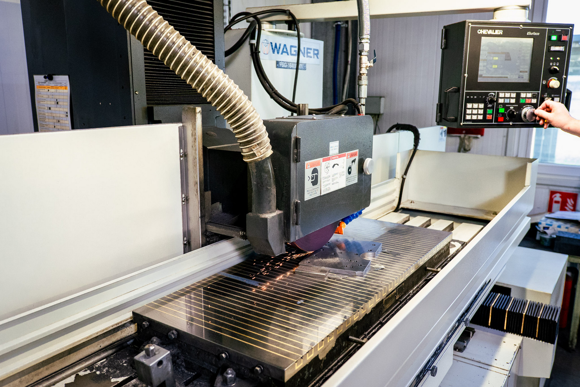Szlifowanie realizowanie jest w pełni automatycznie na dużej płycie elektromagnetycznej lub bezpośrednio na stole roboczym. Stół roboczy napędzany jest hydraulicznie i porusza się na szlifowanych i hartowanych indukcyjnie prowadnicach. Aby osiągnąć najwyższą dokładność i precyzję obróbki, szlifierka magnesowa CHEVALIER FSG 1640 ADIV wyposażona została w funkcję dynamicznego wyważania i automatycznego obciągania tarczy szlifierskiej.