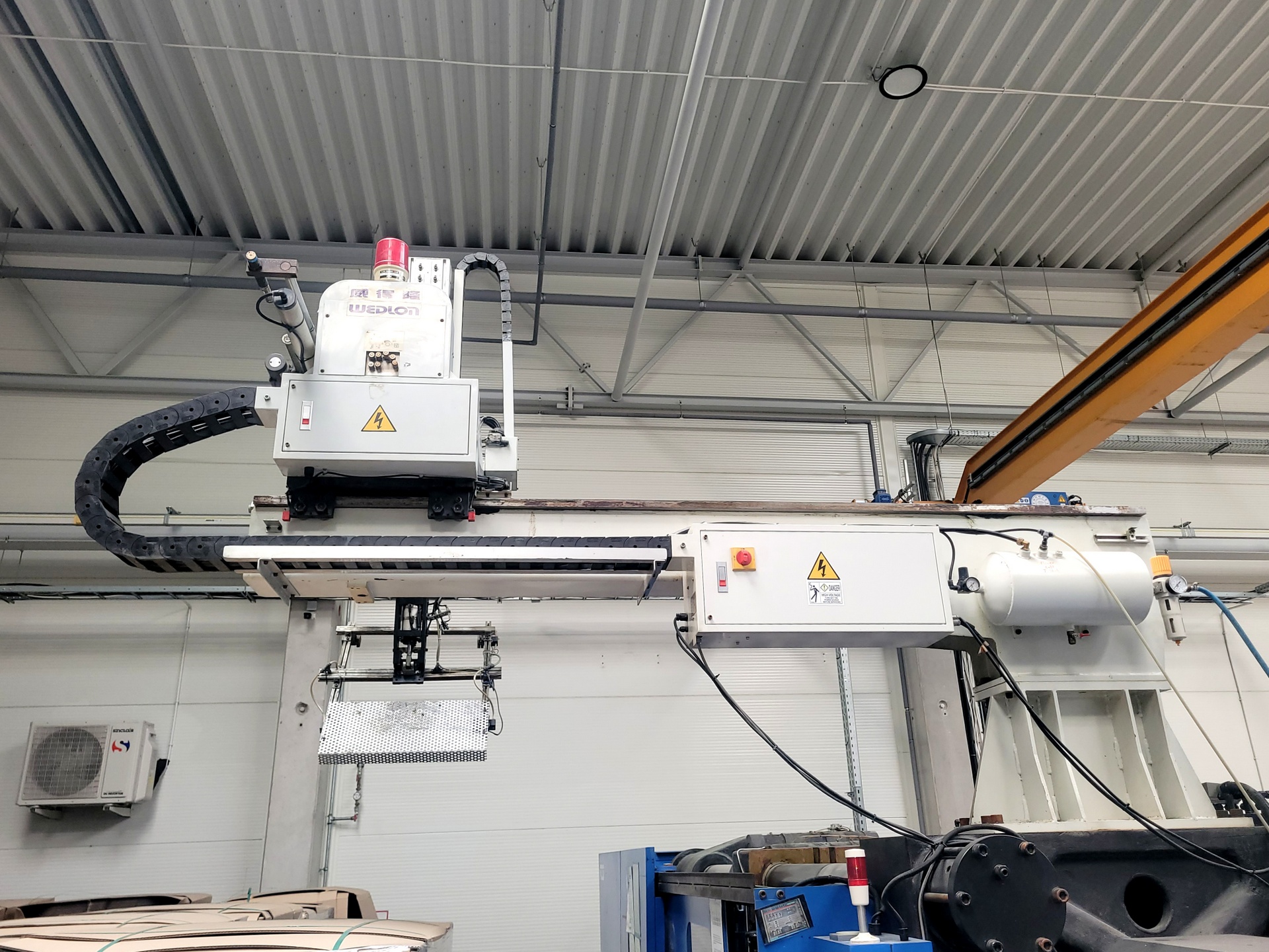 Wtryskarka do tworzyw sztucznych FCS SD-600 M zbudowana została w 2009 roku na Tajwanie przez FU CHUN SHIN MACHINERY MANUFACTURE CO., LTD. Maszyna wyróżniająca się wysoką wydajnością i niezawodnością to doskonały wybór do ekonomicznej produkcji elementów plastikowych. Elementy te wytwarzane są niezawodną metodą formowania wtryskowego która polega na doprowadzeniu uplastycznionego tworzywa sztucznego do formy, a następnie zwarcia jej z wysoką siłą nacisku. Działający z maksymalną siłą 600 ton precyzyjny system zamknięcia formy gwarantuje osiągnięcie wysokiej powtarzalności oraz jakości produkowanych elementów. W celu pełnego zautomatyzowania całego procesu, wraz z maszyną współpracuje robot, który po zakończonej obróbce odbiera gotowe wypraski z przestrzeni roboczej na przenośnik taśmowy. Wtryskarka FCS SD 600 M waży 24 tony.