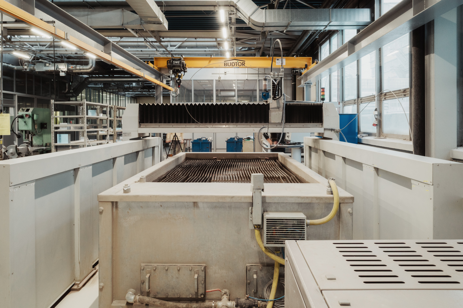ECKERT Opal WaterJet wyróżnia się solidnym stołem wodnym z podwójnym systemem krat WEMA. Konstrukcja wykonana z zamkniętych profili stalowych zapewnia wysoką stabilność podczas nawet najbardziej intensywnych wyzwań. Wszystkie elementy jezdne zabezpieczone zostały z kolei szczelnymi osłonami mieszkowymi. Rozwiązanie to gwarantuje nieprzerwaną pracę maszyny przez wiele lat użytkowania.