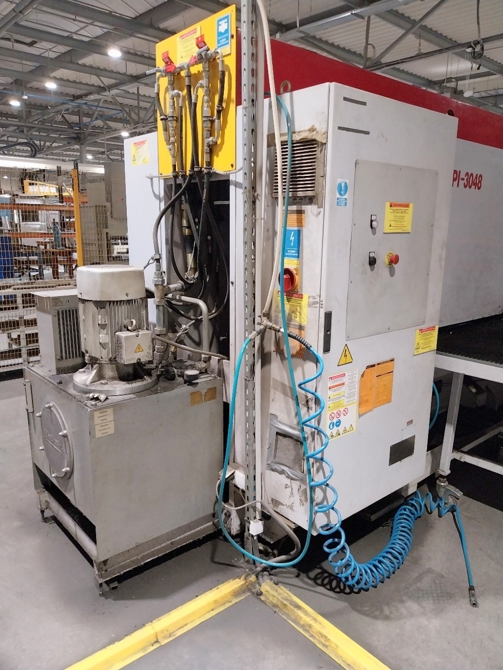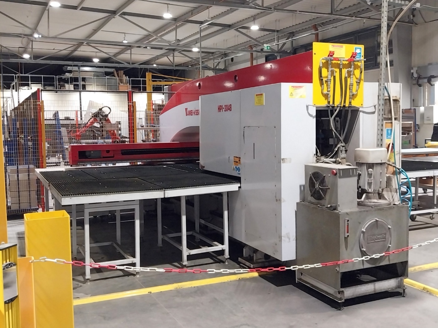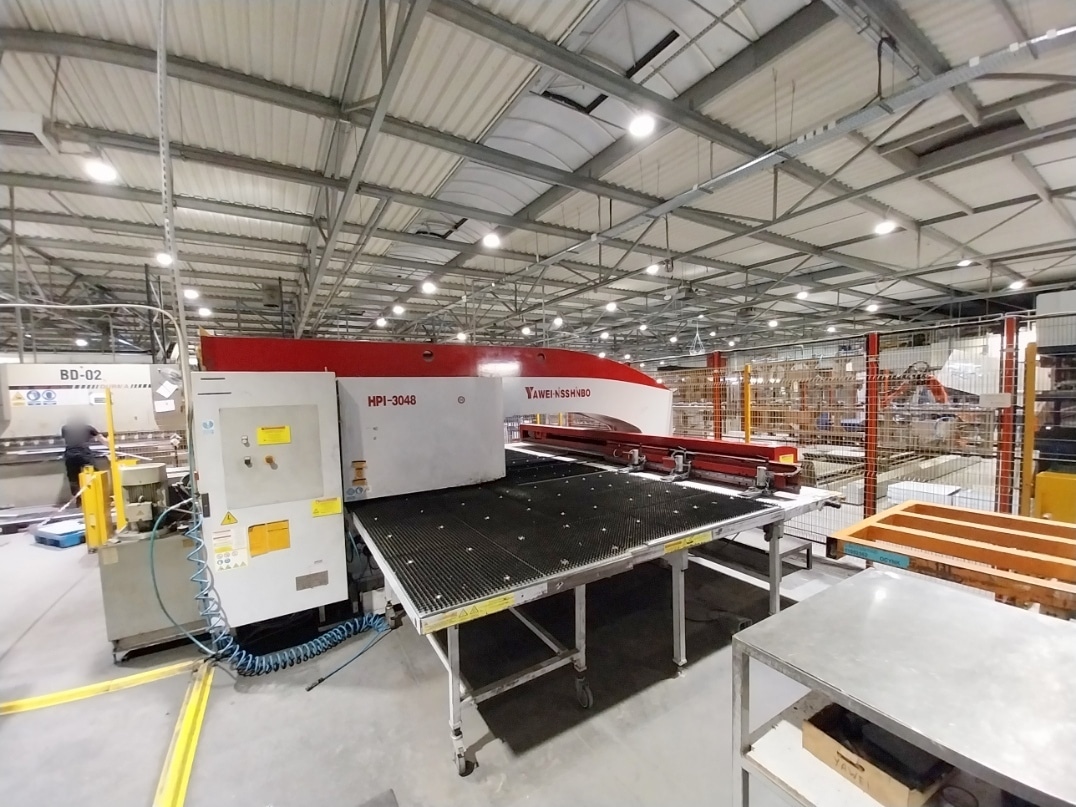 Wykrawarka rewolwerowa YAWEI NISSHINBO HPI 3048 zbudowana została w 2011 roku w Chinach przez Jiangsu Yawei Machine Tool Co., Ltd. Maszyna przeznaczona jest do precyzyjnej obróbki arkuszy blachy o maksymalnej grubości 6,35 mm. Proces obróbczy realizowany jest za pomocą niezawodnej głowicy roboczej, działającej z maksymalną siłą 30 ton. Posuw materiału realizowany jest z kolei na dużym stole szczotkowym, który zapobiega powstawaniu rys i zadrapań na powierzchni detalu, a także znacząco obniża poziom hałasu. Całość uzupełnia inteligentne sterowanie CNC marki SIEMENS z wieloma przydatnymi funkcjami. Wykrawarka CNC HPI-3048-36LA2 waży 18000 kg.