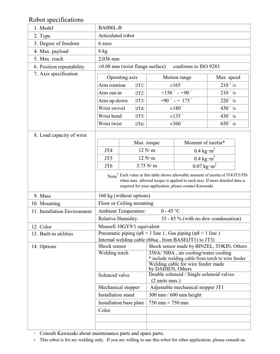 Dane techniczne poszczególnych części zrobotyzowanego stanowiska spawalniczego KAWASAKI BA006L