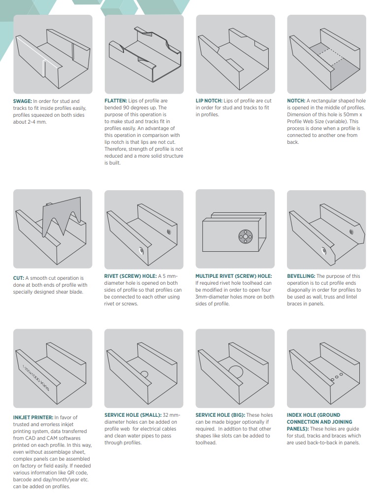 IZAN MAKINA IZ5 rollform hattı şu anda C75x1.2mm ve C100x1.2mm profillerin üretimi için yapılandırılmıştır. Üretim döngüsü, aşağıdaki işleme kabiliyetlerine sahip güvenilir bir takım kafası aracılığıyla gerçekleştirilir: